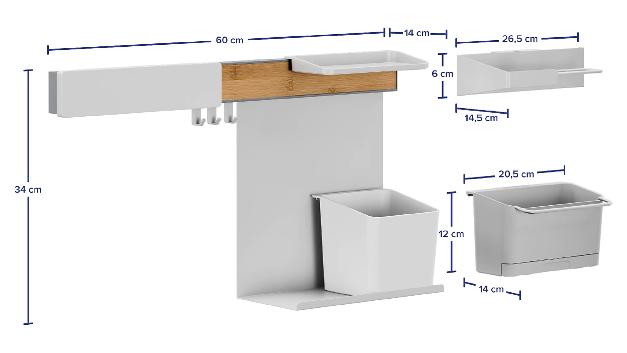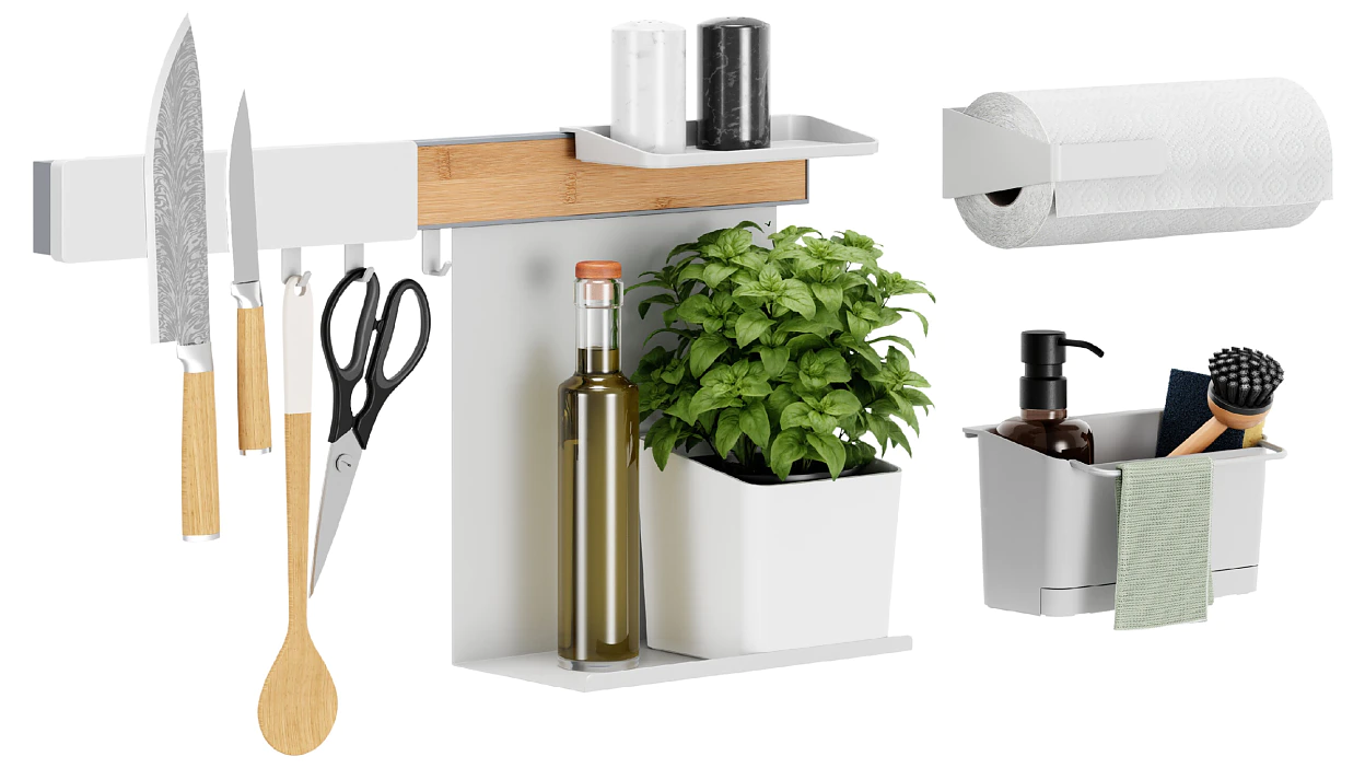 - W zestawie: reling, doniczka na zioła, 2 adaptery, 2 półki, listwa magnetyczna, organizer do zlewu, 3 haczyki, uchwyt na ręcznik papierowy i uchwyt do montażu w poziomie